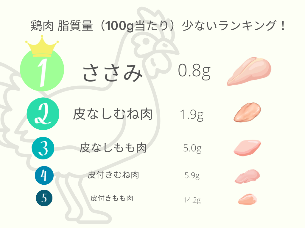 その中でもやはり気になるのは脂質ですよね。今回は脂質量の少ない部位別チキンランキングをご紹介したいと思います♪