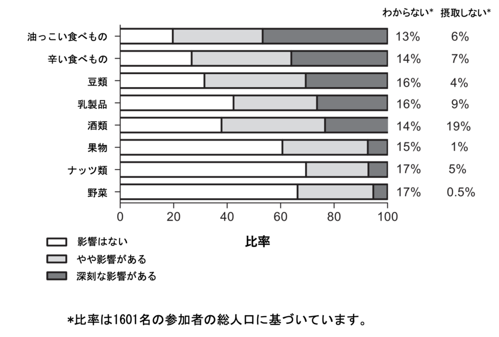 食品カテゴリーでは油っぽい食べもの、辛い食べもの、豆類、酒類で多くの患者さんが消化器症状を経験していました。