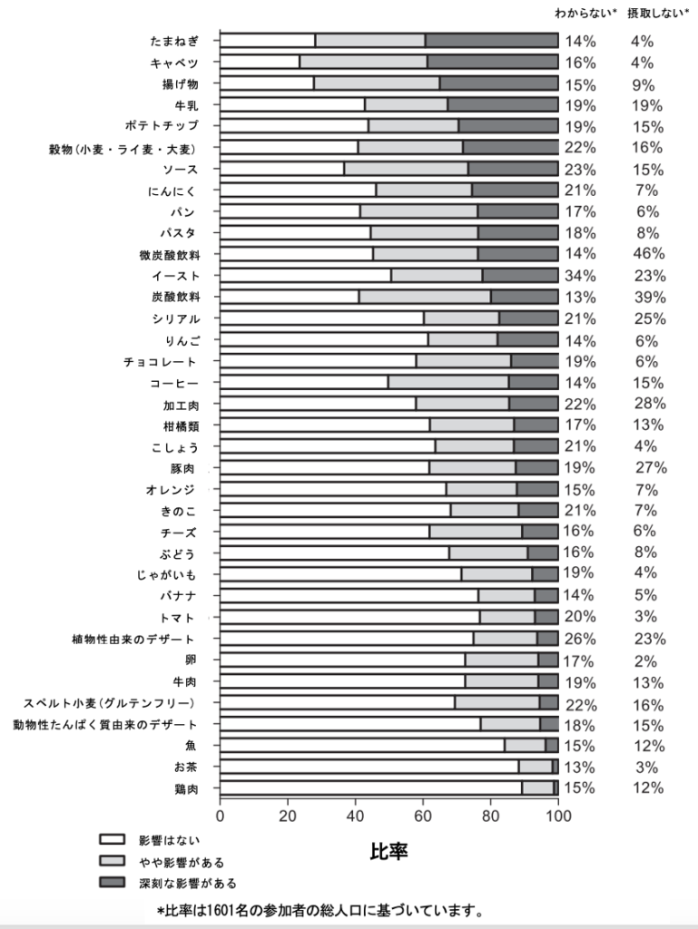 IBS患者さんでは食事に関する悩みが多いことがさまざまな研究で示唆されています。では実際にどのような食品で消化器症状を経験しているのでしょうか?