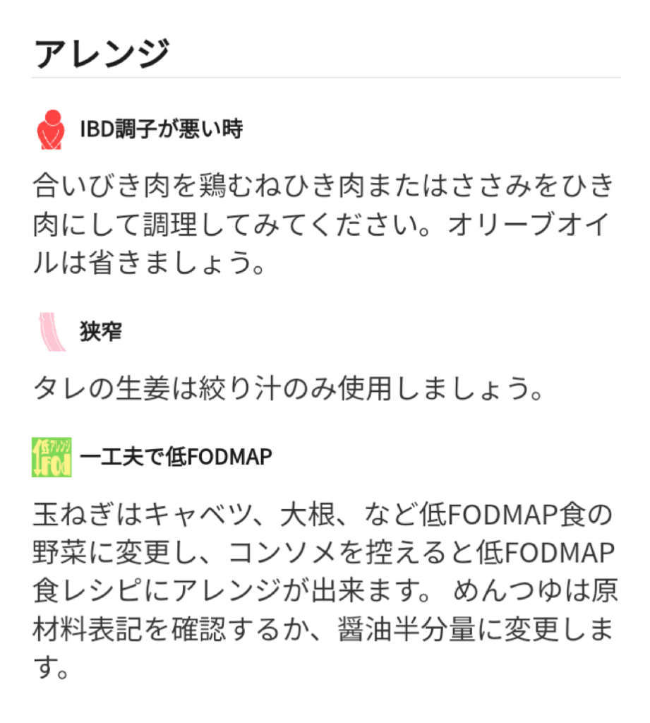 レシピ内のアレンジを読んでいただくと、低FODMAP食へのアレンジ方法のパターンが身につくかと思います。ぜひじっくりご覧いただきご活用くださいね。
