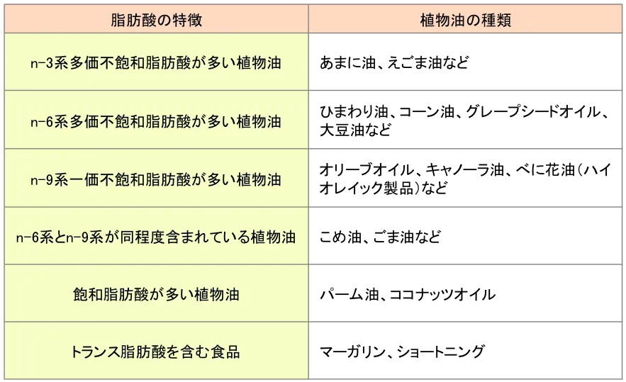 油脂類は主に飽和脂肪酸、n-3系多価不飽和脂肪酸、n-6系多価不飽和脂肪酸、n-9系一価不飽和脂肪酸の4種類の脂肪酸と呼ばれる成分が組み合わさって出来ています。主な脂肪酸を含む植物油は下記の図の通りです。