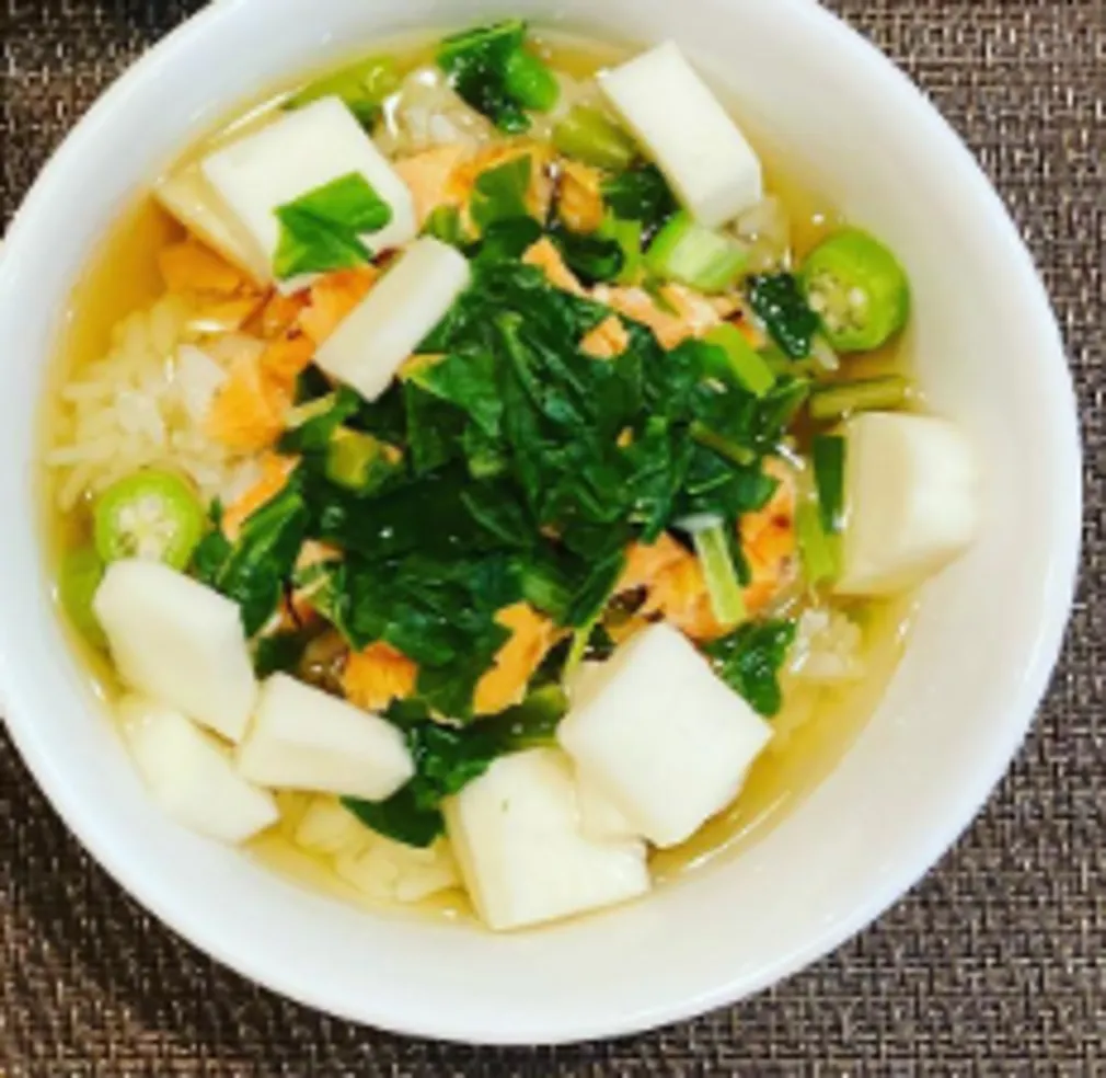 焼いた鮭、ほうれん草、はんぺん、おくらが入った白だしのお茶漬けです。トッピングはアレンジ自由です。ご飯を煮ていないため、さらさらとして食べやすいと思います。