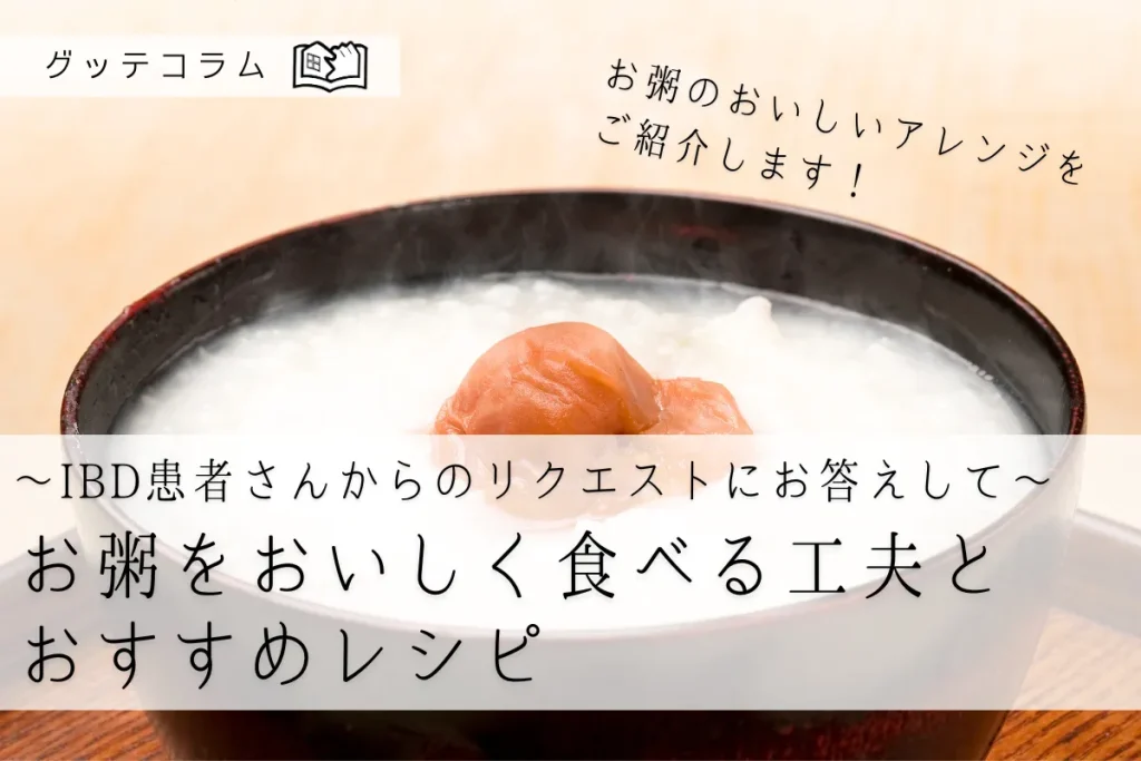 『お粥が苦手な人向けの特集。結構周りでも聞くので。お粥に合わせるもの、海苔の佃煮やたいみそみたいなIBDで調子悪くても大丈夫なものが知りたいです。あと、雑炊だったら食べれる人もいますが、それは味があるからだけじゃなく、さらさらしてるからかもしれないです。私は水分多めでさらさらしてると、お粥だけでも食べれてたので。』