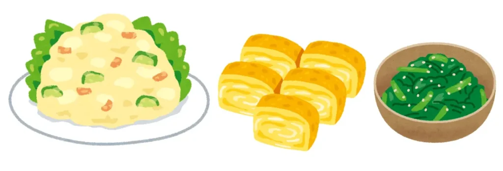 ア:ポテトサラダ イ:だし巻き卵 ウ:ほうれん草のゴマあえ