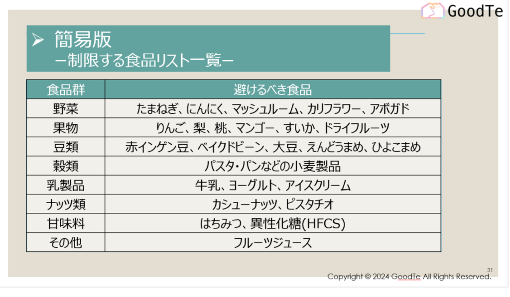簡易版低FODMAP食 制限する食品リスト一覧