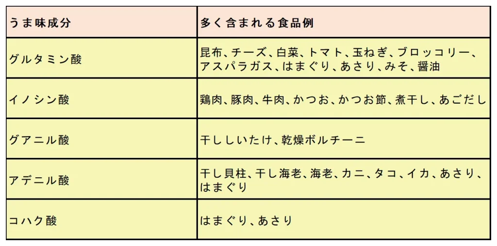 • 主なうま味成分はグルタミン酸、イノシン酸、グアニル酸の3つである