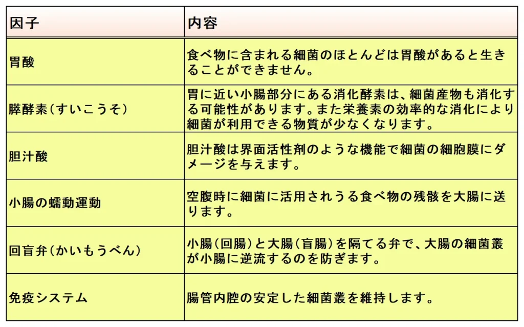 小腸の細菌のコントロールに影響を与えると考えられている因子は以下の表となります。