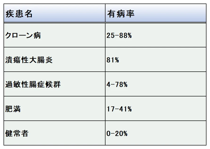 SIBOの有病率についてはまだ実態が把握できていないと言われていますが消化器の病気との関連が示唆されています。